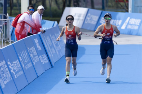 杨晓婷在引导员的牵引下完成“残特奥会”铁人三项比赛