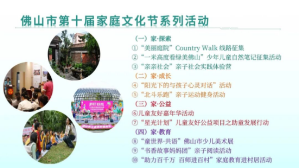 为深入贯彻落实习近平总书记关于注重家庭家教家风建设重要论述精神,扎实推进佛山市家庭文明建设工作,佛山市妇联于2025年5月17日正式启动“佛山市第十届家庭文化节”。文化节以“童心共语 幸福有约”为主题,统筹推出“家·探索”“家·成长”“家·公益”“家·教育”四大板块,共十项重点活动。